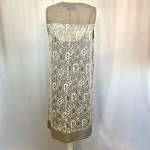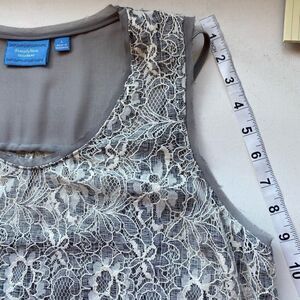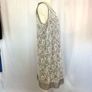 Simply Vera by Vera Wang dress..White & gray lace overlaying a gray attached slip..this easy, pullover dress has a vintage vibe with a raw filmy lace around the edges of neck & arms..Versatile, could be dressed up & worn to a formal event, or dressed down with some casual shoes..could be styled with a belt ( this dress does not come with one) or left loose. Also, there are pockets..yes!