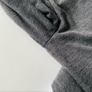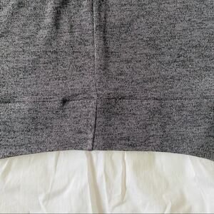 Lightweight dark gray knit with faux layered button down look. Scoop neckline with fitted sleeves. The bottom has an attached faux white button down shirt with real snaps. Minor pilling in a few spots on the sleeves and sides but nothing under the arms. The white button down does have some darkening of the white from normal wear.