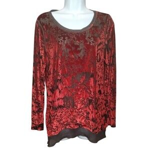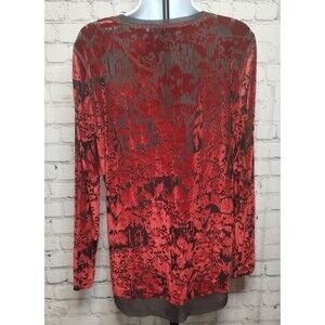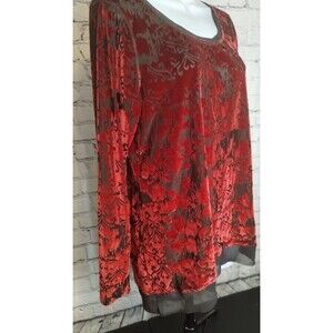 Simply Vera Wang Shirt Womens Size L Red Grey Black Velvet Floral Semi Sheer