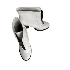 Step up your shoe game with these white patent leather ankle boots, featuring a front zipper with ring detail. These shoes aren't just boots; they're an experience. The chunky heel offers a height boost, perfect for reaching the top shelf—or just looking fabulous while trying.