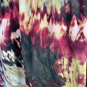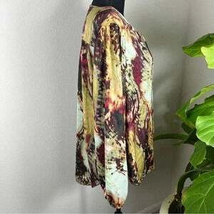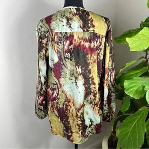 Soft and silky, pullover, long sleeve, tie front, high/low hem, elastic cuff blouse in EXCELLENT pre-loved condition! Size: Large. No holes or stains. **Vegan belt is no longer available** Mixture of colors: Burgundy, brown, yellow, greenish-yellow, gold.