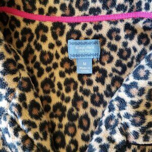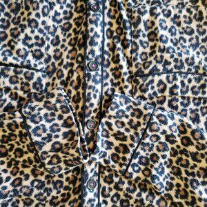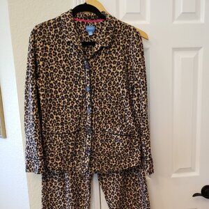 Very good pre-owned condition. Cute leopard print. Button up top with 2 pockets Size M. Fleece. 23 inch sleeve length. 29.5 inch pants inseam.