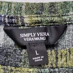 This Simply Vera Wang top in size Large features a stylish Green Striped Pattern with a Tie closure at the Round Neck. The 3/4 Casual Sleeves and Pleated accents add a touch of sophistication to the basic design. Made of a blend of Polyester, Spandex, and Rayon, this top is lightweight and offers a comfortable stretch fit, perfect for everyday wear.
