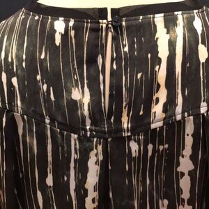 Simply Vera Vera Wang silky black/ forest green/ecru watercolor print. Scoop neckline with small sheer black band. Slit back neckline with button closure. back bodice with center pleat . Long solid black sleeves that are a fine ribbed knit. Hemline sideseam slits. High- low hem front to back. Body 100% polyester. Sleeves cotton/ modal blend. Size medium. New no tags. Nonsmoking home.