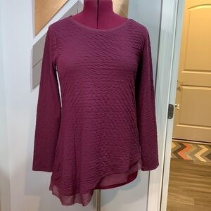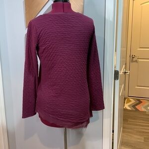 Minor fraying at the bottom and slight peeling at the collar and arms. Size medium. Features an asymmetrical him with tall detail at the bottom and collar. Slight quilting throughout. maroon/dark purple in color.