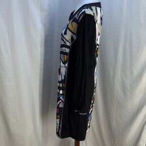 This stylish sheath dress showcases black and white colorblock with a multicolor abstract print, complemented by solid black three-quarter sleeves. The crew neck and soft fabric make it ideal for a casual event or a night out. Graffiti art with DELK OMAHE - a form of street art - on the front.