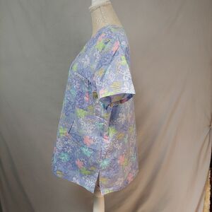 This scrub top is in like new condition. Very clean, barely used. Light blue with pink, green, blue and white pastel colored flowers. Fabric is very soft.