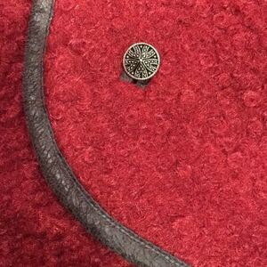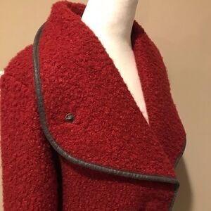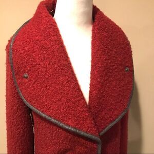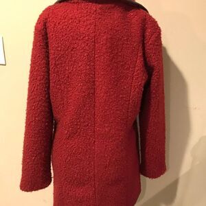 Great burgundy colored coat with large buttoned down lapels , side zipper , faux suede trim, pockets