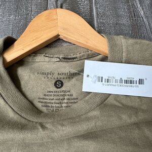 NWT women’s size Small Simply Southern Collection t-shirt top with “Ain’t My First Rodeo / Buck Around & Find Out” raccoon on horse graphic on army or olive green background. Please see photos for size.