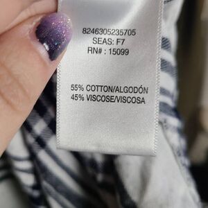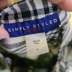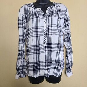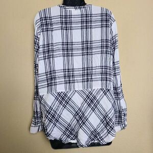 This is a black and white long sleeved top by Simply Styled. It is plaid print and has a half length button panel on the chest as well as buttons at each cuff. Note this top is longer in the back than in the front.