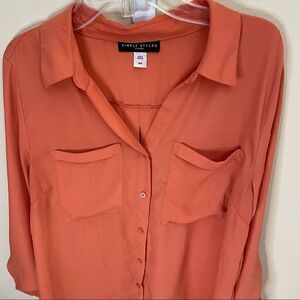 Simple Styled by Sears , lightweight button up top, casual coral color , flowing, flowy material, complete with pockets and mid button up sleeves.