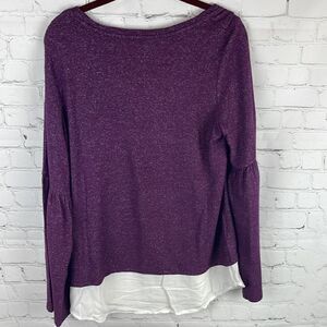 Purple sweater long sleeve, flared sleeves 28” long Faux layered bottom white button up New without tags