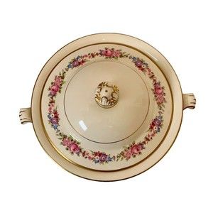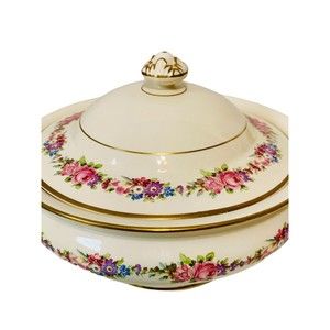Bowl and Lid are Ivory Colored with Floral Design and Gilding Around Both
