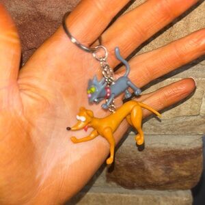 Fun keychain featuring a cartoon dog and cat from the Simpsons. Perfect for adding character to your keys.