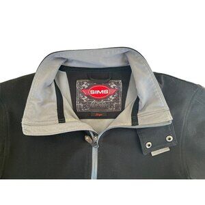 Sims woman's full zip varsity jacket.  Jacket is black with gray and black ribbed cuffs and hem.  It has a double zip front and a snap closure neck.  It's made of 100% polyester and is a woman's size large.