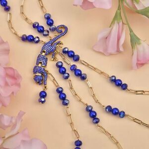 Simulated Blue Pearl Multi Gemstone Paper Clip Chain Necklace With Leopard Charm