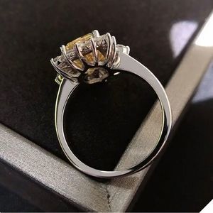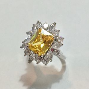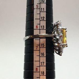 This is a silver-tone, simulated citrine and imitation diamond, cubic zirconia, statement ring or cocktail ring. It measures in between a size 6.25 and a 6.5.