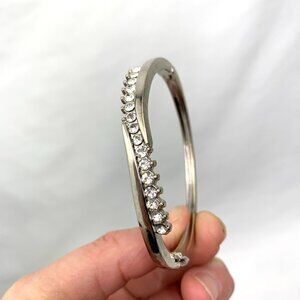 Gorgeous silver tone bangle embellished with a row of simulated diamonds. Hinged opening expands from 2.5" to approximately 3.5".