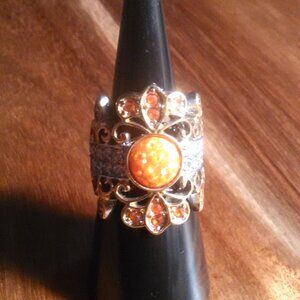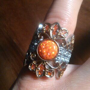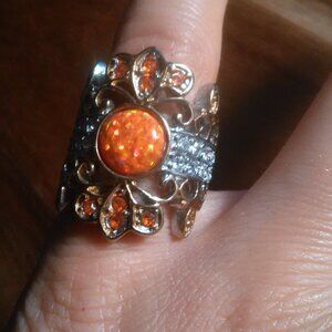 This gorgeous ring features a simulated opal stone with accenting orange and white crystals. The ring is set in gold over stainless steel. Size 6. Like new condition.