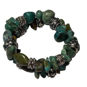 Simulated Turquoise & Silver Tone Stone Coil Flex Bracelet Variscite Very good condition, no chips or cracks. Coil wire magnetic, but not all silver beads are.