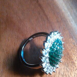 This ring features green and white cubic zirconia stone in a sunburst design. The ring is set in rhodium over 925 sterling silver. Size 6 and is 3.20 ctw. Brand new.