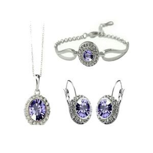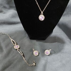 Light Purple stone surrounded by clear stones new in package only opened to photograph comes with 1 necklace 1 set of earrings for pierced ears and 1 bracelet