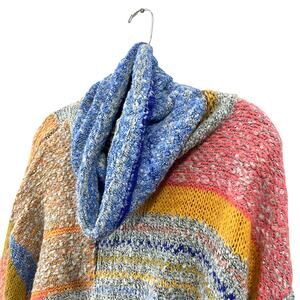 The sweater features a cowl turtleneck, a cropped length, and a boxy, oversized fit. The design includes a variety of colors and patterns, such as blue, orange, pink, and gray, in a chunky knit style.