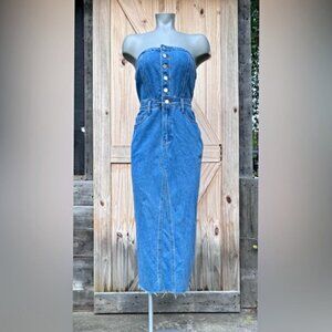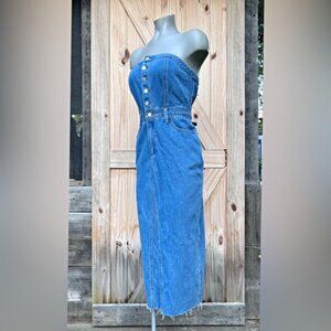 Sincerely Jules Blue Denim Strapless Button Up Raw Hem Midi Dress~S~New