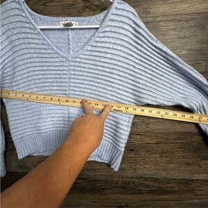 Embrace the cozy charm of this blue V-neck sweater from Sincerely Jules, featuring a ribbed knit pattern that adds texture and style. The relaxed fit and medium to heavy weight make it perfect for cooler weather, while the cropped length offers a modern touch.