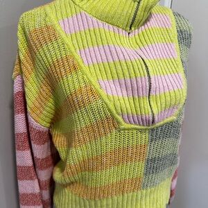 Sincerely Jules Collared Quarter Zip Sweater Neon Striped Cropped Color Block XL. Cuffed puff sleeves. Soft and warm. Asymmetrical mix of pastel and neon colors. Excellent used condition. No rips, stains or defects. Please see pictures for measurements.