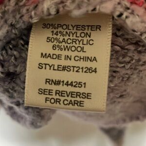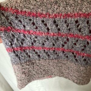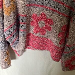 Stay cozy and stylish with this colorful knit sweater. Featuring a blend of pink, gray, and orange hues, this sweater is perfect for adding a pop of color to your wardrobe. Ideal for casual outings or a relaxed day at home.