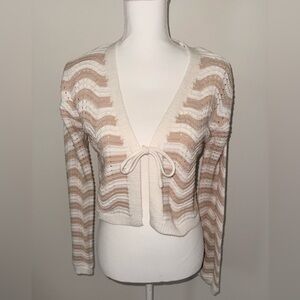This lightweight cardigan from Sincerely Jules features a chic chevron pattern in cream and tan, perfect for layering. The cropped design with a tie closure and V-neck adds a modern touch to any outfit.