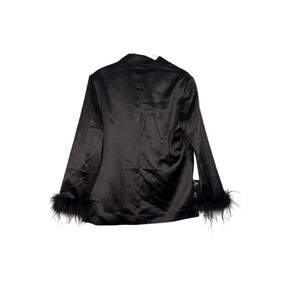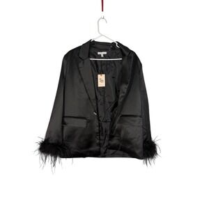 Sophisticated blazer with a playful twist, this black jacket features unique feather detailing at the cuffs, adding a touch of glamour and fun. The blazer has a sleek, tailored silhouette with a single-button closure and faux front pockets. Fully lined, this blazer is perfect for making a statement at cocktail parties, evening events, or any occasion where you want to add a touch of elegance and flair to your outfit.