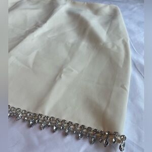 Sincerely Jules Ivory White Rhinestone Fringe Mini Skirt. Classic off white mini skirt with hidden zipper up the back. Front is line with a rhinestone drop fringe. One rhinestone missing, shown in photo, but not noticeable. Excellent condition. Perfect for a bridal event, bachelorette, concert, eras tour, night out. Size Medium.