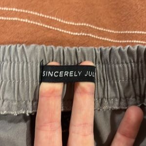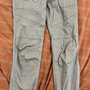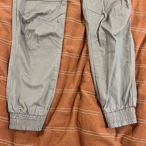Never been worn. Light gray joggers. Large deep pockets. Elastic on the top and bottom. Different designs on the legs. 98% cotton 2% spandex