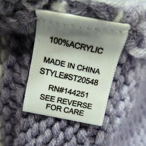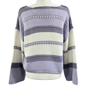 Good used condition, with no stains or tears. A pale purple and white cropped sweater, with large stripes. Has a curved v-neck, flare sleeves, and a relaxed fit.