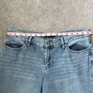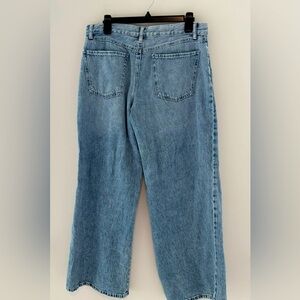 Chic straight leg barrel design. Light blue hue. Versatile and stylish. My daughter bought them and then didn’t ever wear them. No flaws. Comes from a smoke/pet free home.