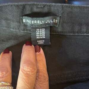 Sincerely Jules black denim maxi skirt, featuring a retro cargo style with front slit and useful side pockets. This skirt, made in China, is a US size 26 (also CA, UK, EU, AU 5/26), providing a comfortable and stylish fit for a modern casual look. The material is durable denim, ready for everyday wear.
