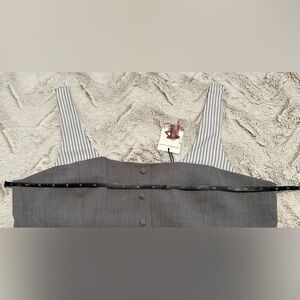 Round neck top with straps. Contrasting combination fabric. Covered button detail on the front. Side zip closure with concealed zipper. Grey stripes and Grey bustier (similar to corset look)