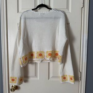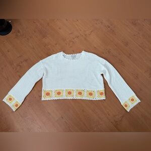 This elegant V-neck sweater from Sincerely Jules showcases a beautiful blend of white and yellow hues, highlighted by a charming floral border. The textured knit pattern adds depth, while the cropped length offers a modern touch. Perfect for layering, this sweater combines simplicity with decorative flair.