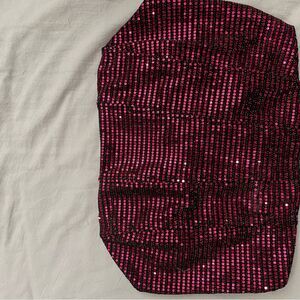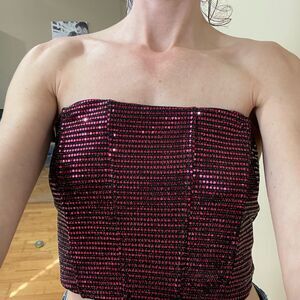 Sincerely Jules sequin crop top. Can be work strapless or with adjustable black straps. I’m usually an XS on top, so this seems to be a true Small. No obvious flaws in sequins.