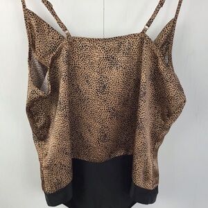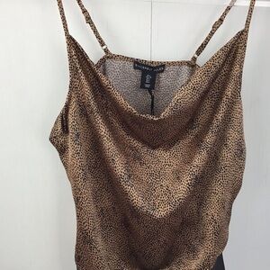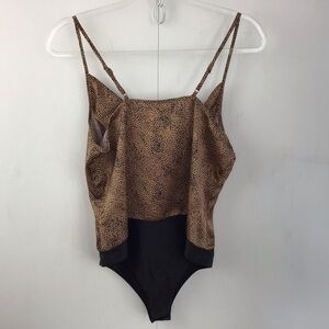 Fantastic piece for creating all this season’s trends. Mini animal print with bronze background. Adjustable spaghetti straps to accommodate various torso lengths. Crotch snap to keep it from riding up, and drapey slip neckline. This will be a go to closet staple.