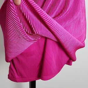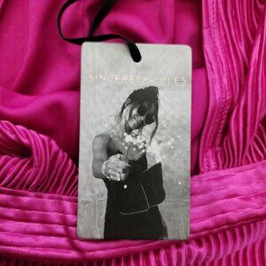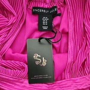 New with tags, Sincerely Jules silky soft pleated hot pink cross over halter neckline dress with a peek a boo gap, size medium. 100% polyester.