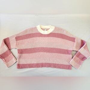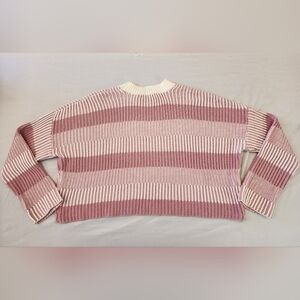 *This sweater features a classic crew neck design with a stylish pink and cream striped pattern. Crafted with a soft, knitted texture, it offers a relaxed and comfortable fit, perfect for casual wear.