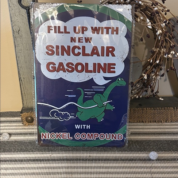 Vintage-style Sinclair Gasoline metal sign with vibrant colors. Features a green dinosaur and bold lettering.