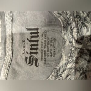 Stylish gray tee with bold Sinful graphic. Soft fabric and short sleeves for comfort. Torn distressed look.