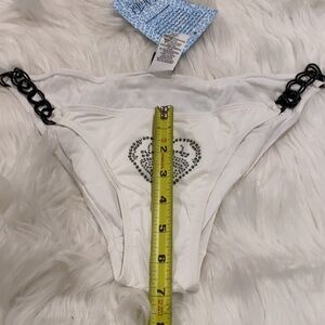 White bikini bottom with black metal chain detail at the sides and embellished front and back with rhinestones. NWT.