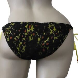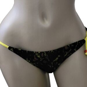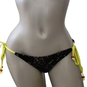String bikini bottom with black lace overlay with yellow/black/orange design underneath. Ties on each hip. Great new with tags overall condition.