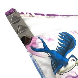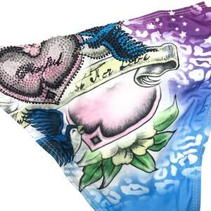 Get ready to turn heads with these Sinful by Affliction Tropic Swimsuit Bikini Bottoms! These bottoms feature a vibrant animal print with playful blue birds and hearts, perfect for adding a touch of fun to your swimwear collection.