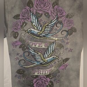 Sinful by Affliction MD womens t shirt Love and Pride grey colored. have rhinestones on the birds on the back cute shirt.
